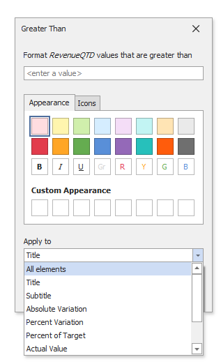 Das Dialogfeld mit den Darstellungseinstellungen enthält die Dropdown-Liste Anwenden auf. Wählen Sie ein layoutelement aus, auf das Sie eine Formatierungsregel anwenden möchten. Wählen Sie All elements aus, um die Formatierungsregel auf alle Kartenelemente anzuwenden.