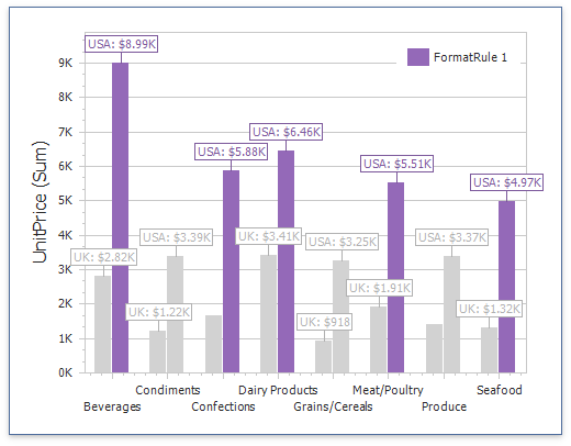 Aktivieren Sie In Legende anzeigen, um dem Diagramm Informationen über die angewendete Regel hinzuzufügen. Legen Sie das Feld Caption fest, um den Text der Legende anzugeben. Bei Bereichsformatregeln wird der Text der Legende automatisch generiert und hängt von den Bereichsintervallen ab.