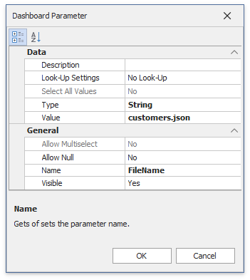 Wählen Sie Dashboard-Parameter hinzufügen aus der Dropdown-Liste der Eigenschaft Wert aus, konfigurieren Sie den Dashboard-Parameter im aufgerufenen Dialogfeld Dashboard-Parameter und klicken Sie auf OK.