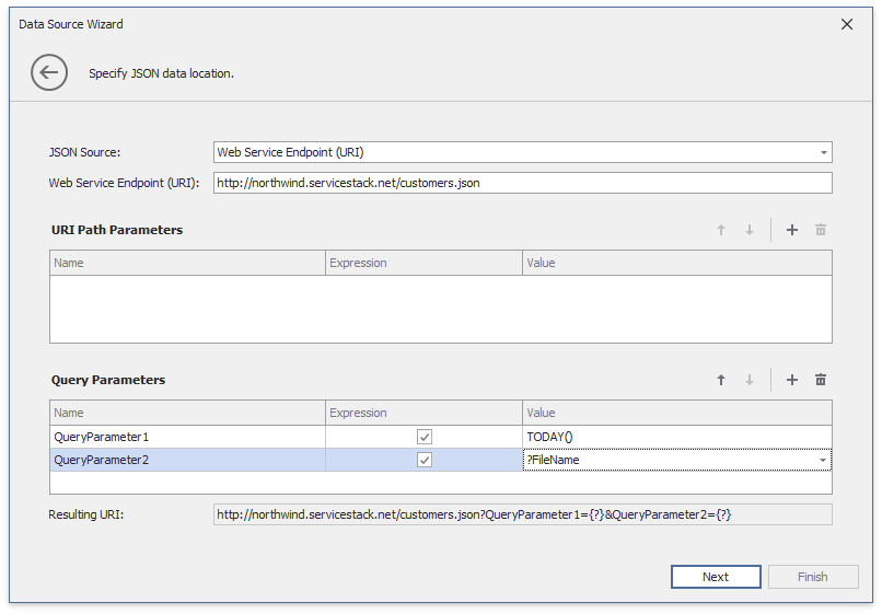 Das schreibgeschützte Feld Resultierender URI zeigt das Ergebnis an: einen JSON-URI.