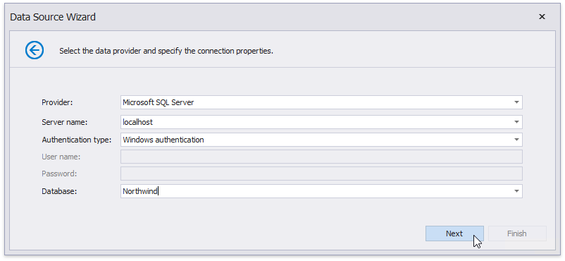 Je nach ausgewähltem Datenanbieter kann es erforderlich sein, auf dieser Seite zusätzliche Verbindungsoptionen (z. B. Authentifizierungstyp und Datenbankname) anzugeben.