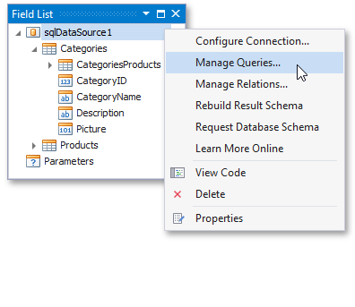 Die neu erstellte SQL-Datenquelle wird im Knoten Datenquellen des Berichts-Explorers angezeigt. Darüber hinaus wird die Hierarchie der Datenquelle durch Feldliste widergespiegelt. In beiden Bereichen können Sie mit der rechten Maustaste auf die Datenquelle klicken, um auf ihre Einstellungen zuzugreifen.