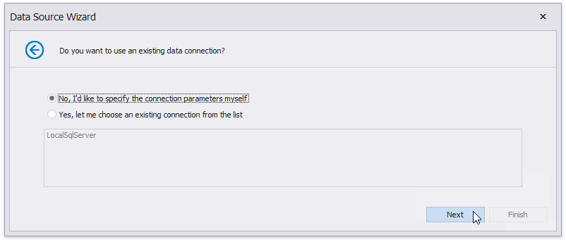 Auf der nächsten Seite können Sie angeben, ob Sie eine vorhandene Datenverbindung verwenden oder eine neue Datenverbindung von Grund auf neu erstellen möchten. Wählen Sie die erste Option, um eine neue Verbindung zu erstellen, und klicken Sie auf Weiter.