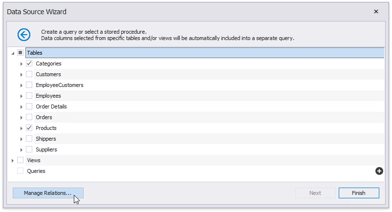 Klicken Sie auf Fertig stellen, um den Datenquellen-Assistenten abzuschließen. Wenn die ausgewählten Abfragen oder gespeicherten Prozeduren parameters enthalten, können Sie zur nächsten Assistentenseite wechseln und deren Werte definieren.