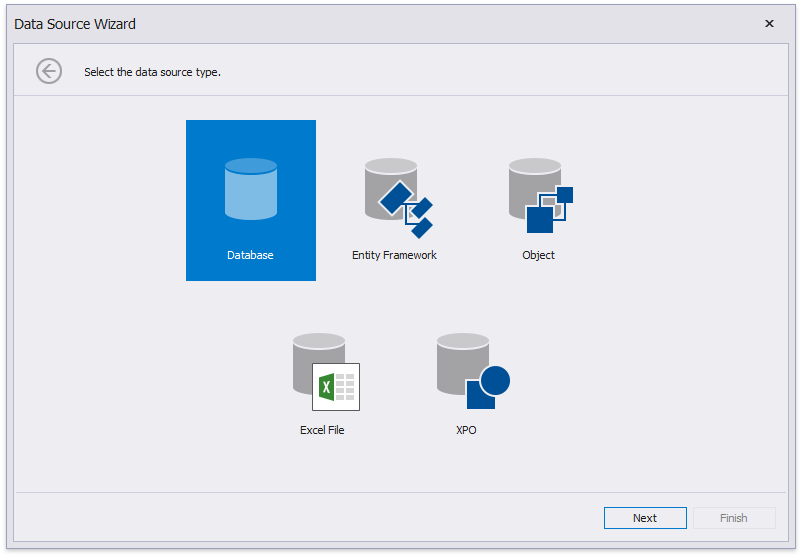 Wählen Sie auf der ersten Seite des aufgerufenen Datenquellen-Assistenten die Option Datenbank aus, und klicken Sie auf Weiter, um fortzufahren.