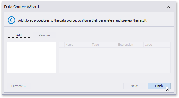 Die nächste Seite des Assistenten ist nur verfügbar, wenn das aktuelle Entitätsdatenmodell gespeicherte Prozeduren enthält. Auf dieser Seite können Sie der Datenquelle gespeicherte Prozeduren hinzufügen und deren Parameter konfigurieren. Klicken Sie auf Fertig stellen, um den Assistenten zu beenden.