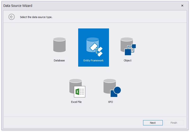Wählen Sie auf der ersten Seite des aufgerufenen Datenquellen-Assistenten das Entity Framework aus, und klicken Sie auf Weiter.