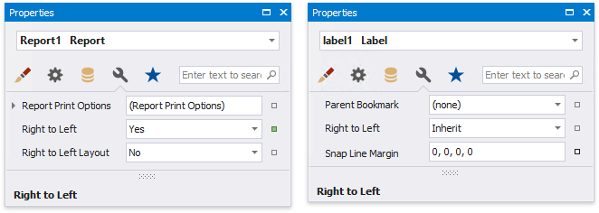 Wenn die Eigenschaft Von rechts nach links eines Berichts auf Ja festgelegt ist, können Sie auch die Eigenschaft Layout von rechts nach links aktivieren, die die Position von Steuerelementen innerhalb von Berichtsbändern angibt. Wenn Sie das Layout von rechts nach links aktivieren, werden auch die Seitenränder eines Dokuments vertauscht (es wird unmöglich, Steuerelemente außerhalb des rechten Seitenrandes zu platzieren).