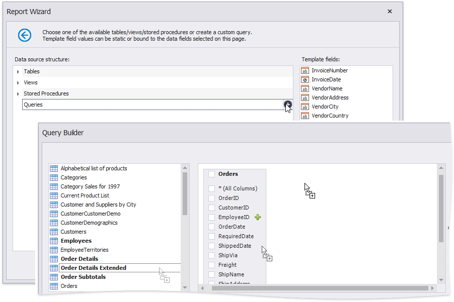 Sie können die Datenfelder mehrerer verschiedener Tabellen oder Ansichten kombinieren, indem Sie eine benutzerdefinierte Abfrage erstellen. Klicken Sie auf die Plusschaltfläche der Kategorie Abfragen und verknüpfen Sie im aufgerufenen Abfrage-Generator Datentabellen und -ansichten basierend auf Schlüsselspalten.