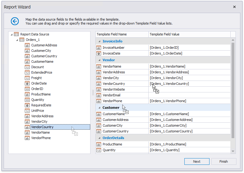 Auf der nächsten Seite des Assistenten können Sie die Beziehungen zwischen den Feldern der Datenquelle und den vordefinierten Vorlagenfeldern angeben.