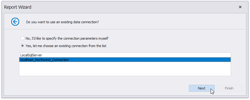 Geben Sie auf der nächsten Seite des Assistenten an, ob Sie eine vorhandene Datenverbindung verwenden oder eine neue erstellen möchten. Wählen Sie für dieses Lernprogramm eine vorhandene Verbindung aus und klicken Sie auf Weiter.