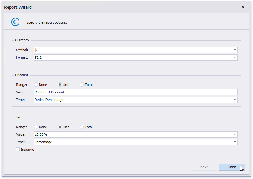 - Wert- Gibt den Rabatt-/Steuerwert an, der statisch oder an das Datenquellenfeld gebunden sein kann.
