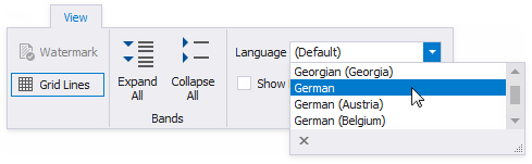 Wechseln Sie in der Symbolleiste des Berichts-Designers zur Registerkarte Ansicht, und wählen Sie die Sprache in der Dropdownliste in der Gruppe Lokalisierung aus.