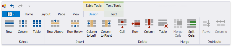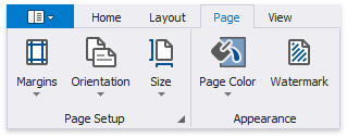 Die Symbolleiste des Berichts-Designers enthält die Registerkarten Startseite, Layout, Seite** und Ansicht für allgemeine Befehle sowie Kontextregisterkarten für Befehle, die sich auf die ausgewählten Berichtssteuerelemente beziehen.