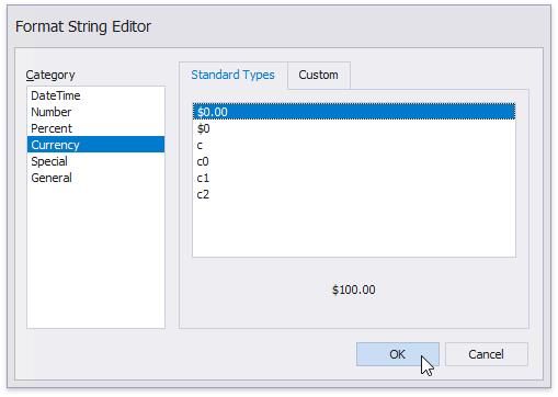 Dadurch wird der Formatzeichenfolgen-Editor aufgerufen, in dem Sie das erforderliche Format angeben können.
