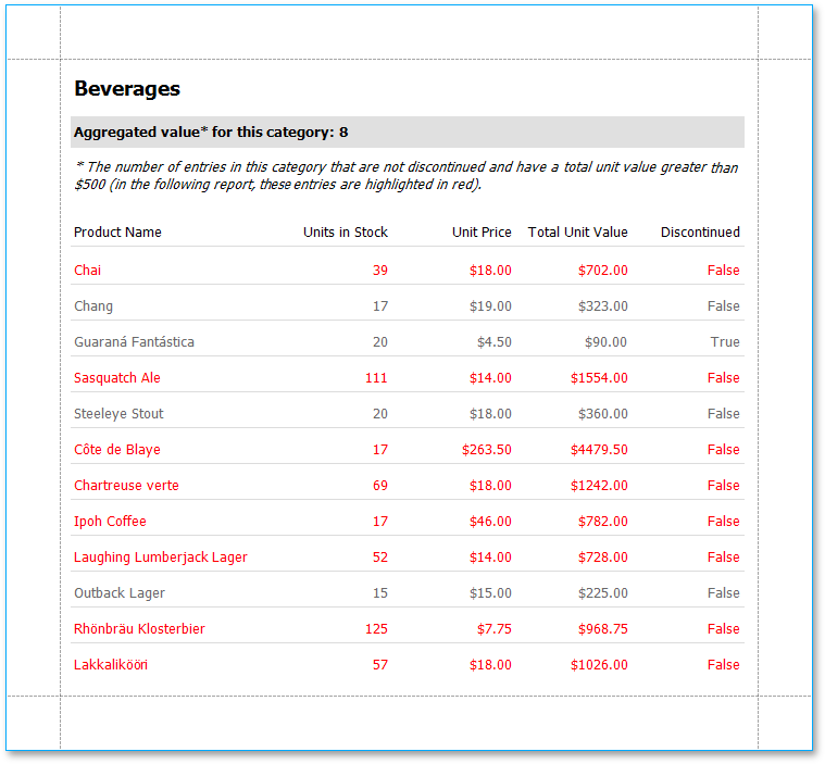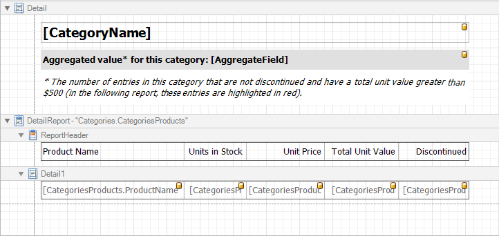 In diesem Lernprogramm werden die Schritte beschrieben, die zum Erstellen eines Berichts mit einem aggregate function erforderlich sind. In diesem Beispiel werden Produkte angezeigt, die nicht eingestellt werden und einen Gesamteinheitswert von mehr als $500 haben.