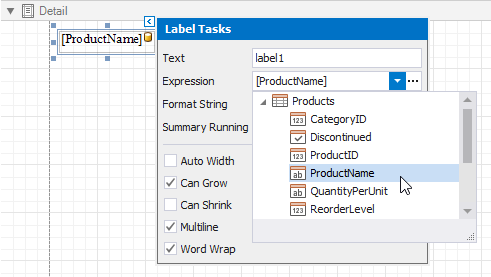 Klicken Sie auf das Smarttag eines Steuerelements, erweitern Sie die Dropdownliste Ausdruck, und wählen Sie ein Datenfeld aus.