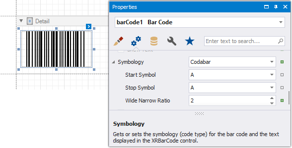 Erweitern Sie in property grid die Liste Symbologie und geben Sie die folgenden Eigenschaften an, die für Codabar spezifisch sind: