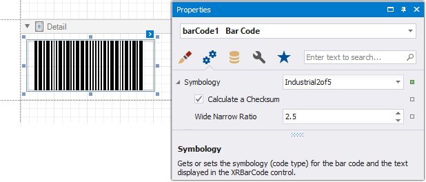 Erweitern Sie im Eigenschaftenraster die Liste Symbologie und geben Sie die folgenden Eigenschaften an, die für Industrial 2 von 5 spezifisch sind: