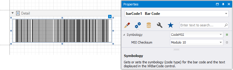 Erweitern Sie in Eigenschaftsraster die Liste Symbologie und geben Sie die folgende Eigenschaft an, die für MSI spezifisch ist: