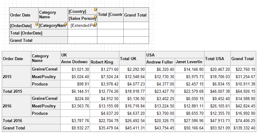 Beschreibt die Kreuztabellenzeilenfelder, Spaltenfelder, Datenfelder und das Formatieren von Feldwerten.