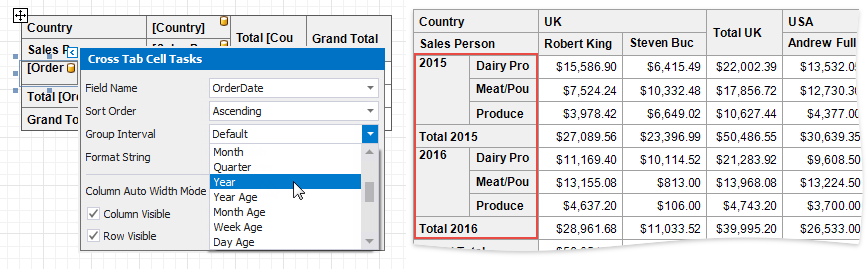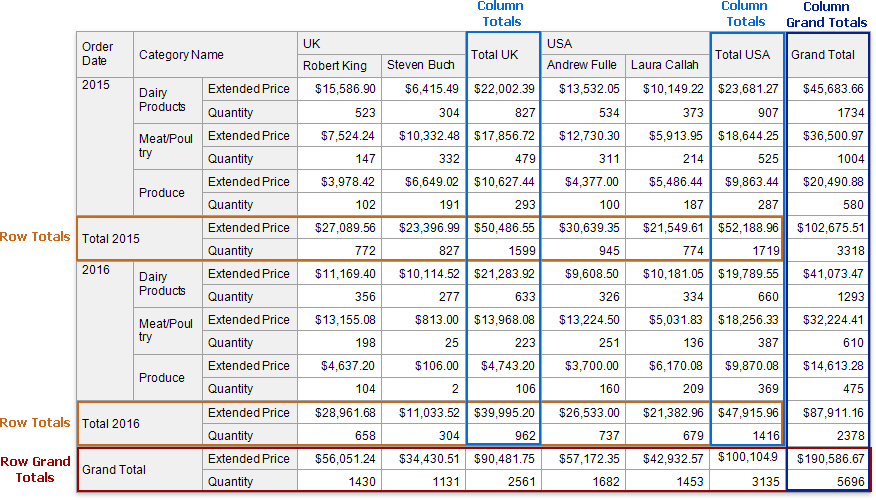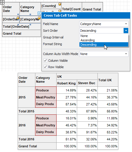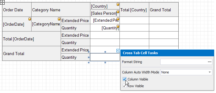 Die Kreuztabelle zeigt Zeilen- und Spaltenfeldwerte in aufsteigender Reihenfolge an. Verwenden Sie die Eigenschaft Sortierreihenfolge, um die aktuelle Sortierreihenfolge zu ändern. Legen Sie diese Eigenschaft auf Keine fest, um die gleiche Reihenfolge wie Datensätze in der Datenquelle der Kreuztabelle beizubehalten.