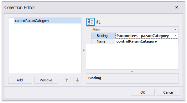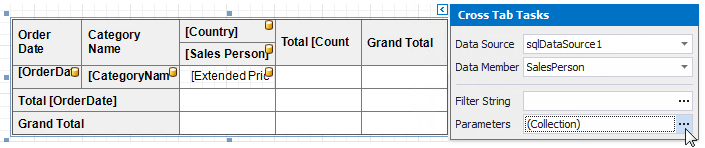 Klicken Sie auf die Schaltfläche mit den Auslassungspunkten dieser Eigenschaft, und fügen Sie im aufgerufenen Auflistungs-Editor Parameter hinzu. Sie können einen Kreuztabellenparameter an einen Berichtsparameter oder an ein beliebiges Datenfeld in einem Bericht binden.