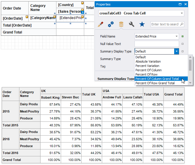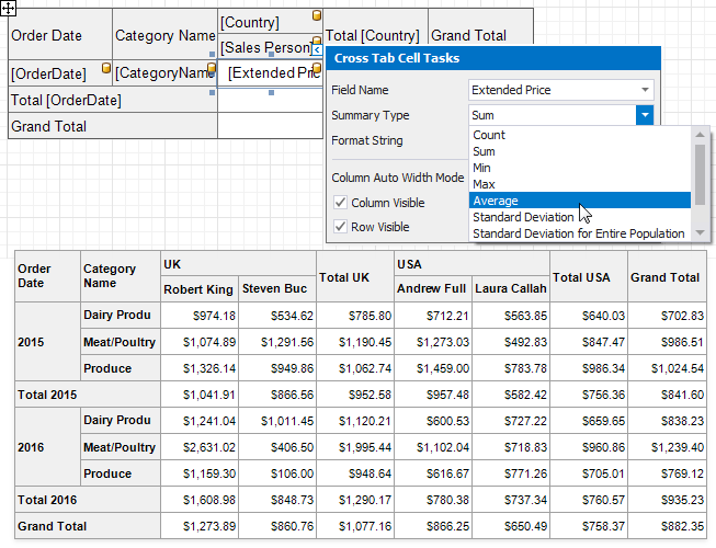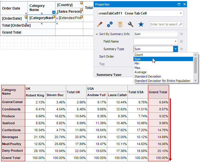 - Verwenden Sie die Summary Type-Eigenschaft, um anzugeben, welche Zusammenfassungsfunktion berechnet werden soll. Der Zusammenfassungstyp kann sich von dem Zusammenfassungstyp unterscheiden, der derzeit in der Kreuztabelle verwendet wird.