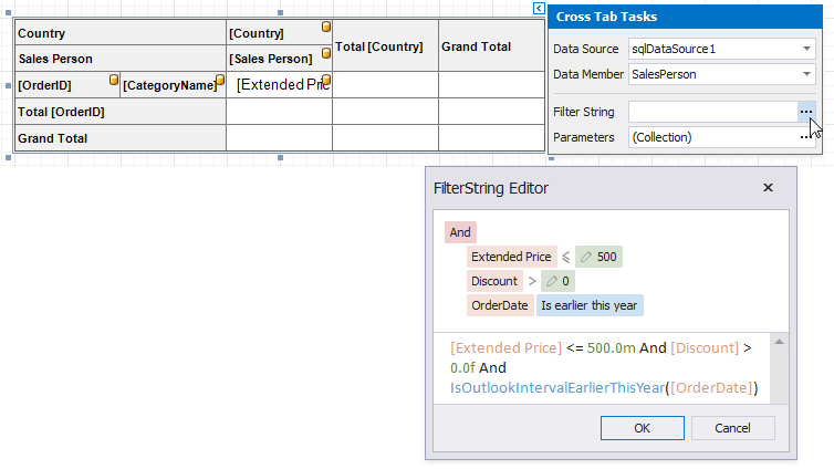 Verwenden Sie die Eigenschaft Filter String der Kreuztabelle, um den FilterString-Editor aufzurufen und die Filterkriterien anzugeben.