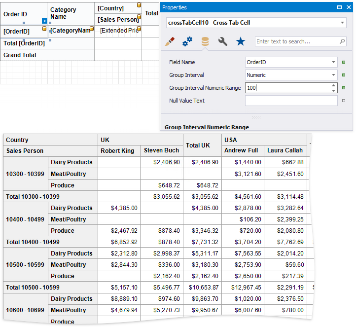 Um numerische Werte zu gruppieren, legen Sie die Eigenschaft Gruppenintervall auf Numerisch fest, und verwenden Sie die Eigenschaft Numerischer Bereich des Gruppenintervalls, um die Intervalllänge anzugeben. Legen Sie beispielsweise den Bereich auf 100 fest, um Datensätze nach 100 Bestellungen zu gruppieren.