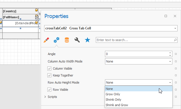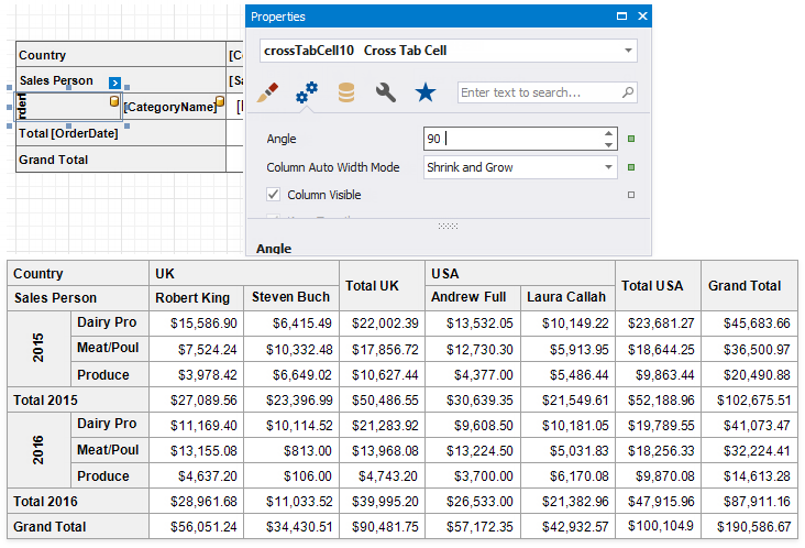 Jede Kreuztab-Zelle stellt die Angle-Eigenschaft bereit, mit der Sie den Text der Zelle drehen können.