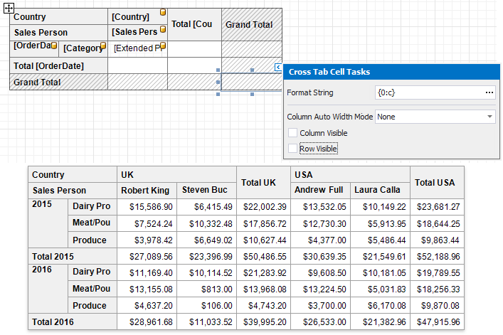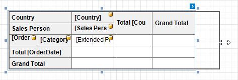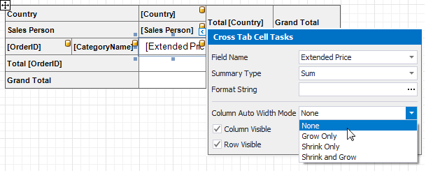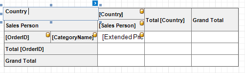 Verwenden Sie die Eigenschaften Zeile sichtbar und Spalte sichtbar einer Zelle, um die Sichtbarkeit von Zeilen und Spalten anzugeben. Wählen Sie beispielsweise die untere rechte Zelle aus und deaktivieren Sie diese Optionen, um Gesamtsummen auszublenden. Zur Entwurfszeit werden unsichtbare Zellen mit einem Schraffurpinsel gefüllt.