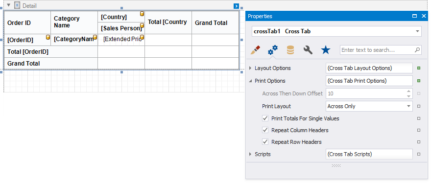 Verwenden Sie die Eigenschaft Druckoptionen, um Druckoptionen anzugeben und zu definieren, welche Kreuztabellenelemente gedruckt werden sollen.