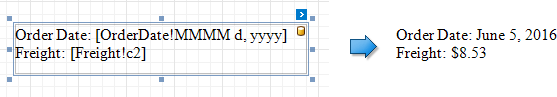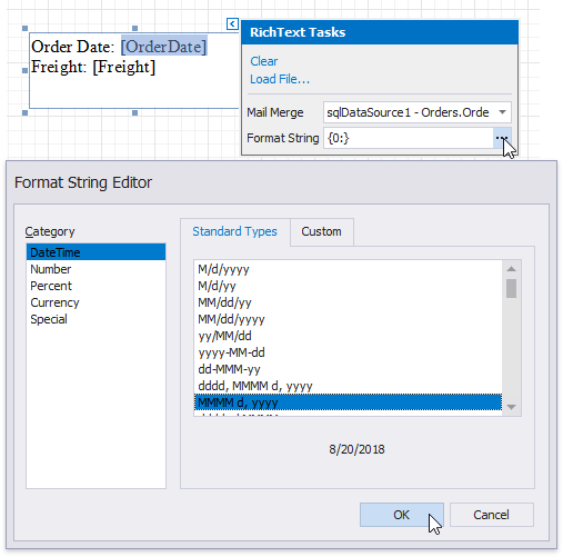 Mit der Seriendruckfunktion können Sie Formate auf eingebettete Feldwerte anwenden. Wählen Sie ein erforderliches Datenfeld aus, und klicken Sie auf das Smarttag des Steuerelements. Klicken Sie auf die Schaltfläche mit den Auslassungspunkten der Eigenschaft Zeichenfolge formatieren, und wählen Sie im aufgerufenen Editor für Formatzeichenfolgen ein integriertes Formatmuster aus.