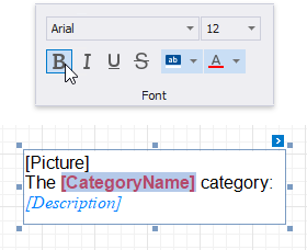 Sie können den Seriendruck nur auf die Text-Eigenschaft des Steuerelements anwenden. Doppelklicken Sie auf das erforderliche Steuerelement auf der Entwurfsoberfläche, um den direkten Editor aufzurufen. Fügen Sie Datenfeldnamen in eckige Klammern ein, um eingebettete Felder zu erstellen, und verwenden Sie beliebige Präfixe oder Postfixe.