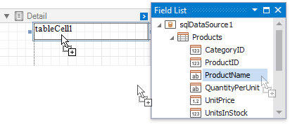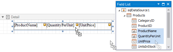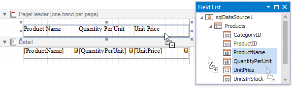 Sie können ein Tabellensteuerelement mit Zellen bound an Datenfelder erstellen, die mithilfe von Field List aus der Datenquelle eines Berichts abgerufen wurden. Wählen Sie Datenfelder aus, indem Sie sie bei gedrückter STRG- oder UMSCHALTTASTE anklicken und auf dem Detailband ablegen.