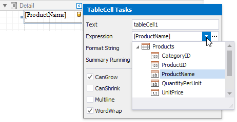 Sie können einzelne Tabellenzellen auf die gleiche Weise wie Label-Steuerelemente an Daten binden. Durch das Ablegen eines Datenfelds auf eine vorhandene Zelle wird diese Zelle an ein entsprechendes Feld gebunden.