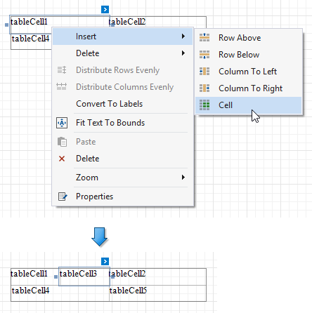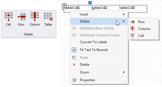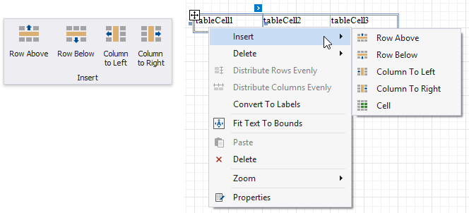 Sie können die Gruppe Einfügen auf der Kontextregisterkarte Tabellentools der toolbar oder die Kontextmenüelemente Einfügen verwenden, um neue Zeilen und Spalten hinzuzufügen. Die hinzugefügten Zellen erben die Größen- und Darstellungseinstellungen der Quellzellen.