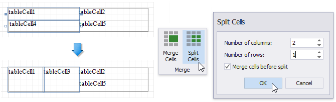Ruft das Dialogfeld Zellen teilen auf, in dem Sie die Anzahl der Spalten und Zeilen zum Teilen der ausgewählten Zellen angeben können. Sie können diese Änderung auf jede ausgewählte Zelle einzeln anwenden oder die Zellen zusammenführen und dann die resultierende Zelle teilen.