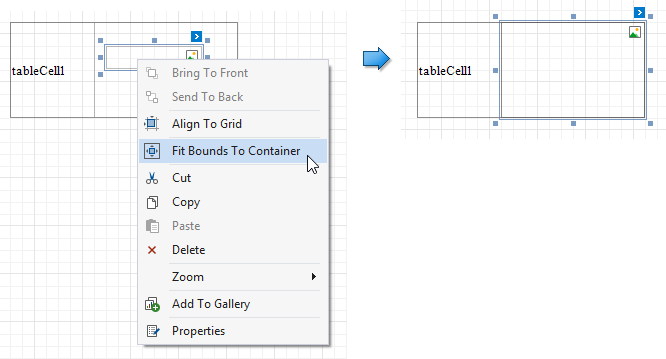 Wenn eine Tabellenzelle nur ein Steuerelement enthält, können Sie mit der rechten Maustaste auf dieses Steuerelement klicken und den Befehl Grenzen an Container anpassen** im Kontextmenü verwenden. Der gleiche Befehl ist auf der Registerkarte Layout der Symbolleiste verfügbar. Mit diesem Befehl wird die Größe des Steuerelements geändert, sodass es den gesamten verfügbaren Zellenplatz (ohne Rahmen) belegt.