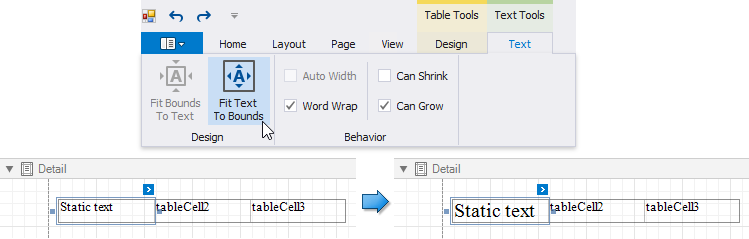 Sie können den Schriftgrad des statischen Textes einer Zelle so anpassen, dass er in die Grenzen der Zelle passt. Verwenden Sie die Schaltfläche Text an Grenzen anpassen** auf der Kontextregisterkarte Text der toolbar, oder klicken Sie mit der rechten Maustaste auf diese Zelle und wählen Sie im Kontextmenü die Option Text an Grenzen anpassen.