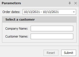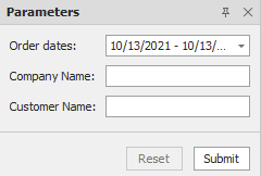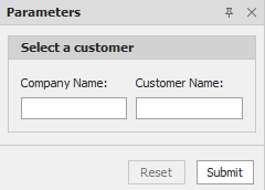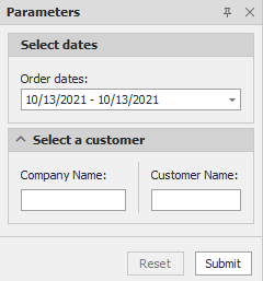 Geben Sie Parameterwerte an und klicken Sie auf Senden, um die Seitenansicht des Berichts zu generieren. Legen Sie die RequestParameters-Eigenschaft des Berichts auf false fest, um ein Berichtsdokument für die Standardparameterwerte anzuzeigen, wenn Sie die Seitenansicht öffnen.