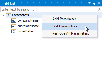 Klicken Sie mit der rechten Maustaste auf den Knoten Parameter in der Feldliste, und wählen Sie Parameter bearbeiten aus.