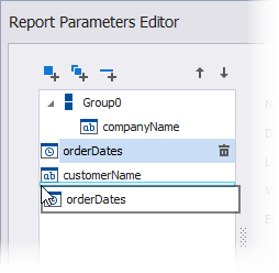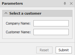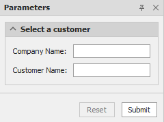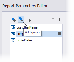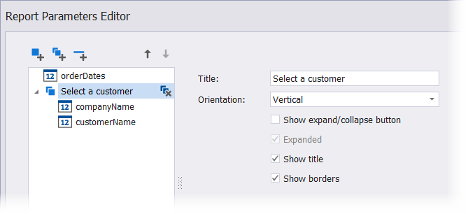 Um eine Gruppe anzupassen, wählen Sie sie aus und verwenden Sie die Editoren auf der rechten Seite, um das Erscheinungsbild der Gruppe einzurichten. Im folgenden Beispiel werden die Parameter customerName und companyName in einer Gruppe namens Select a customer vereint.