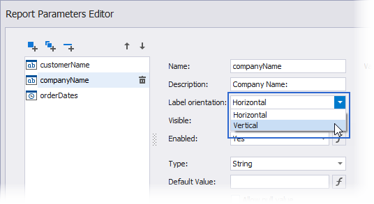 Geben Sie die Eigenschaft Label orientation an, um die Position einer Parameterbeschriftung relativ zu einem Editor auszuwählen.