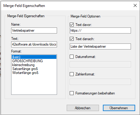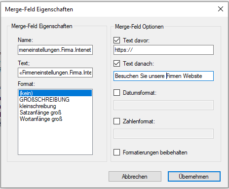 Internetadresse -Dokumentfeld (Merge-Field) -Direkte angabe der URL