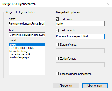 Hyperlink zum öffnen einer E-Mail mit Vorgabe der Empfänger E-Mail Adresse