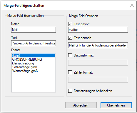Mit einem mailto-Link können neben der E-Mail-Adresse auch Betreff, Kopie, Blindkopie und Nachrichteninhalt voreingestellt werden. Diese Angeben werden im Feld Text hinterlegt.