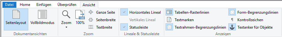 Einstellungsmöglichkeit für die Anzeige des Lineals, der Status- und Seitenleiste. |