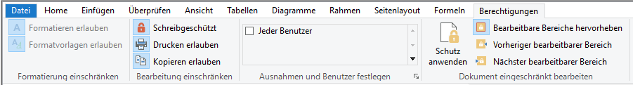Festlegung ob das Dokument schreibgeschützt ist, gedruckt werden darf und Teile des Dokuments kopiert werden dürfen. |